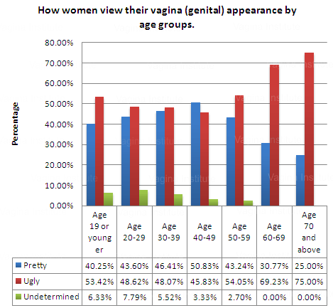Young women who are still in their teens seem to have a perception that they have ugly genitalia more so than pretty genitals. As a woman ages and goes into her twenties, thirties and forties, she gains a bit of confidence and a few more women view their genitalia as something with a bit more sex appeal, but not by much. As overall, over half of the female population sees their own genitals as being more ugly than pretty, in consequence we can deduct that slightly over half of the female population has ugly genitals as oppose to pretty genitalia.