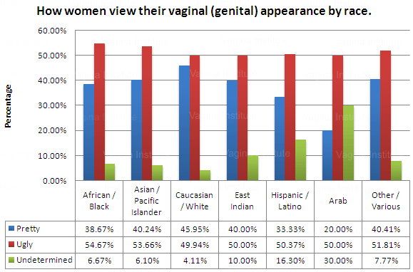 The research indicates that almost all ethnic groups view their genitalia in or close to the same manner as each other. All groups state that their genitals are ugly accounting of half of the female population in all groups without exception, minimal increase in women of African/Black and Asian/South Pacific Islanders heritage, but only a minimum increase.