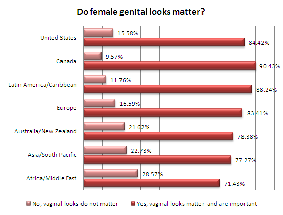 While to a lesser extent, men in other parts of the world, more specifically in Africa/Middle East and in Asia desire beauty of female genitalia, but not to the degree found in the Western World. With this we find that beauty of female sex organs is important all over the world. In Canada, nine out of every ten men desire that their partner’s have pretty genitalia, while in Africa/Middle East seven out of every ten men desire their partner to have pretty genitalia.